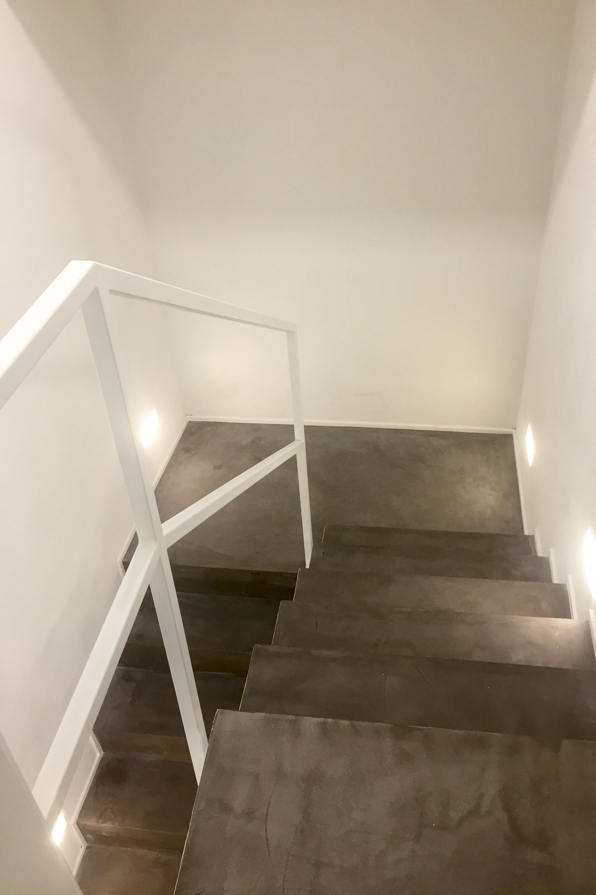 Accedendo dal piano terra la resina ti conduce lungo le scale alla zona giorno del piano primo, collegandosi al bagno, dove la resina si espande sui muri e avvolge il soffitto creando una “scatola” monocromatica. Il resto delle pavimentazioni in legno contrastano con armonia; la parete che separa la zona notte da quella a giorno si colora con una carta da parati e la porta a scomparsa si maschera nel dettaglio cromatico.